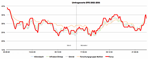 Nach der Bundestagswahl 2002 ein ähnliches Bild. Es ist die Forschungsgruppe Wahlen, die die SPD konsequent abweichend bewertet: deutlich stärker als die Konkurrenz. Forsa aber neigt in keiner Weise dazu, die Wahlchancen der Sozialdemokrten auffallend negativ zu beurteilen: