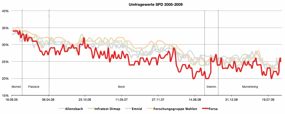 24. Die Kurven zeigen ja eindeutig, dass Forsa den anderen Meinungsforschungsinstituten lediglich etwas voraus ist, beispielsweise werden ja die von Forsa unter Beck vorhergesagten 24,5 % etwas später unter Müntefering auch von allen anderen Instituten bestätigt. Kleiner Scherz. Aber ich finde, Theo hat schon nicht unrecht, wenn er sagt, entscheidend ist doch die Abweichung vom wahren Wert und nicht von anderen Meinungsforschungsinstituten. Und da scheint es doch so zu sein (Quelle: http://de.wikipedia.org/wiki/Bundestagswahl_2009), dass Forsa den wahren Wert 2009 von 23% ÜBERschätzt hat (25%), nur etwas weniger als INFO (27%), Infratest (26%) oder Emnid (26%). Allerdings ist das natürlich nicht unbedingt diagnostisch, da Beck nicht Kanzlerkandidat war. Aber was haben die bei Forsa gegen Steinbrück? Interessant ist sicher auch, auf welche anderen Parteien sich die fehlenden Prozentpunkte bei Forsa verteilen. Im Vergleich zu Emnid beispielsweise gibt Forsa am 19.6. der SPD 3% weniger, die gehen an Grüne (1%), FDP (2%), Sonstige (2%) im Vergleich zu Allensbach gibt Forsa 4% weniger, die gehen an CDU (2%), Grüne (1%), LINKE (1%), Sonstige (1%). Im Vergleich mit Allensbach gibt Forsa der LINKE immer etwas mehr: 1% (19.6.), 2% (22.5.), 2% (1.-3.5.), 1% (17.4.), 1% (20.3.), 0,5% (20.2.), 1% (23.1.), usw. Forsa, das die SPD hasst, liebt anscheinend die LINKE (zumindest mehr als Allensbach). Irgendwo logisch. Aber ist das glaubhaft? Interessant wären jedenfalls Vergleichsgrafiken, die zeigen, wo die Prozentpunkte im Vergleich zu den anderen Instituten stecken.