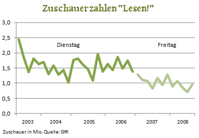Wenn „Lesen!“ weiterhin 15 Prozent aller Zuschauer erreicht, egal ob Dienstags oder Freitags, dann hat sich an der Quote ja nichts geändert.