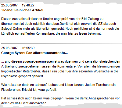 Immerhin diesmal leidet die SZ an Alzheimer („Was Angelina wer? Nein, ich kann mich an keinen Artikel erinnern“), wenn ich mich recht entsinne gab es da doch vor nicht allzulanger Zeit doch den Artikel ueber Handystrahlen, der klammheimlich und ohne Kenntlichmachung voellig umgeschrieben wurde- auch lustig fuer die Kommentare zum urspruenglichen Artikel…