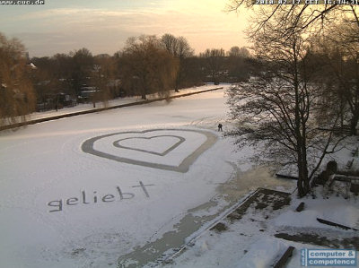 Wenn ich heute zu nichts mehr komme, liegt das daran, dass ich die ganze Zeit auf die Webcam von der zugefrorenen Außenalster gucken muss, wo jemand ein großes Herz im Schnee pflegt.